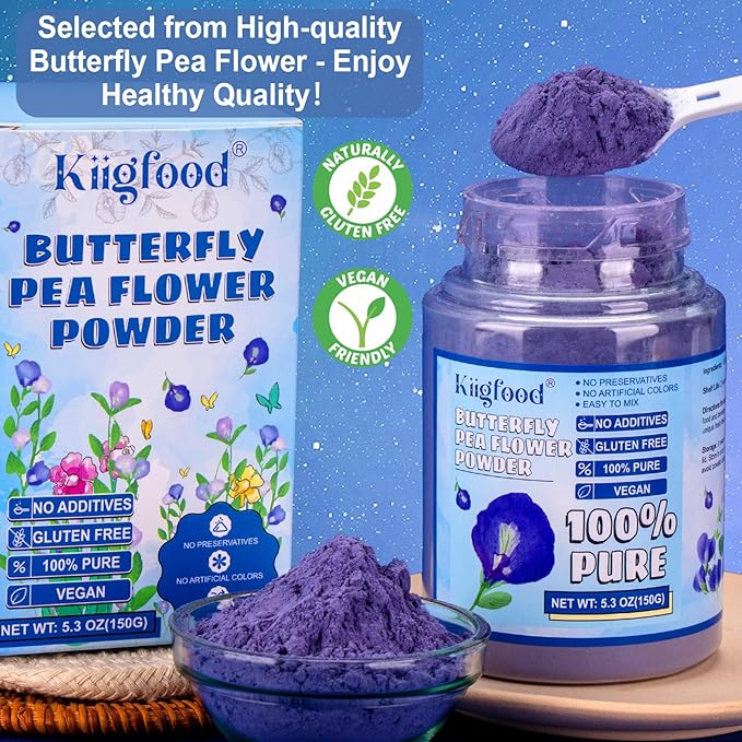 Butterfly Pea Flower Powder - Kiigfood 5.3 oz/150g Pure Natural Blue & Purple Food Coloring, Butterfly Pea Powder for Drinks, Smoothies, Cocktail, Baking, Pasta - Vegan, Gluten-Free, Non-GMO
