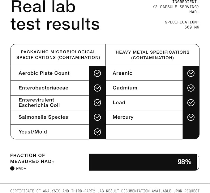 - Third-Party Lab Tested for Purity and Quality: Each batch of our NAD is rigorously tested for purity, potency, and contaminants. We ensure that you get the highest quality product, tested both during and after manufacturing.