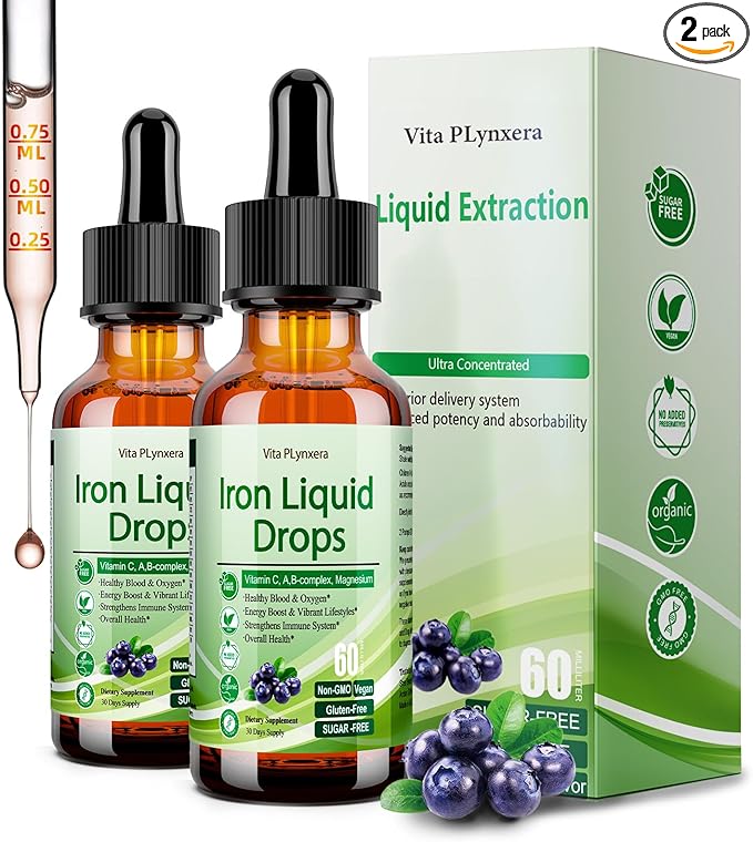 2 Pack Liquid Iron Supplement for Women Men & Kids, Vegan Iron Drops with Vitamin C D, B12, B-Complex, High Potency Liquid with Multivitamin for Anemia, Energy Support, Magnesium Iron Gentle