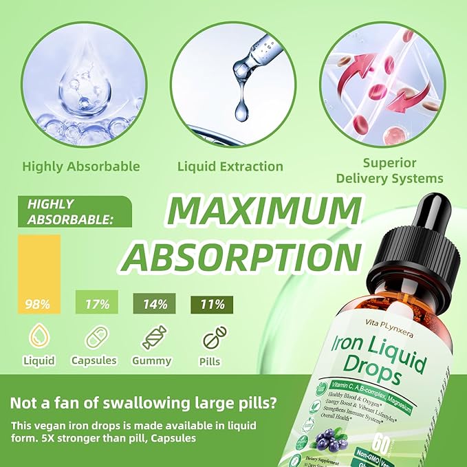 - LIQUID IRON CONCENTRATED GENTLE ON STOMACH: Not a fan of swallowing large pills? This iron vitamin supplement is made available in liquid form. Just take 2 full droppers in your preference drink, or you can place several drops directly under your tongue. 1 times per day or as recommended by your doctor. AND liquid extracts are preferred to the capsules because they are processed through the digestive system faster and absorbed in the bloodstream faster than other forms of supplements. Further, studies show that your body absorbs a higher percentage of minerals and vitamins that come in liquid form