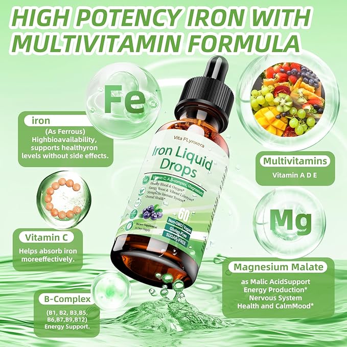 - HIGH POTENCY LIQUID IRON WITH MULTIVITAMIN: The energy support fomula contains 18mg highly bioavailable form of ferrous chelate Iron, Magnesium, a natural source of Vitamin A C D, and vibrant B-complex vitamins (B1 to B12, ) to optimize iron absorption and utilization. The high potency liquid iron with multivitamin ensuring a substantial boost for adults dealing with iron deficiency or anemia*, support energy and overall wellness