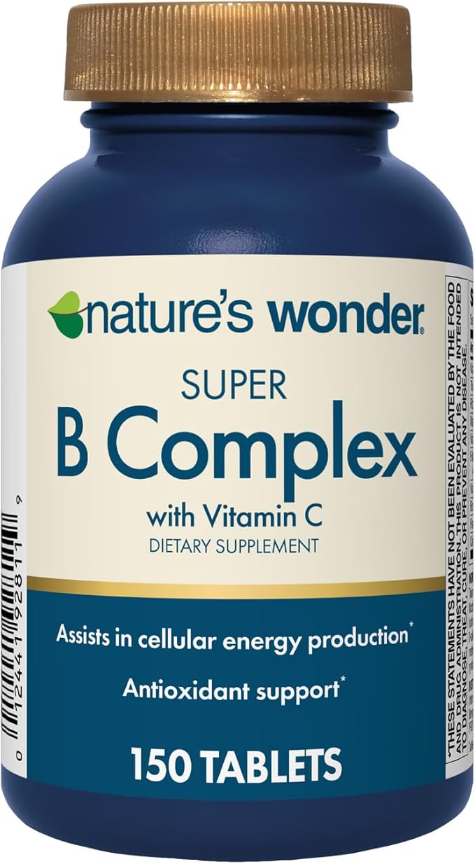 Nature's Wonder Super B Complex with Vitamin C, Vitamin B12, & Folic Acid – Supports Energy Metabolism, Immune Function, Nervous System, Skin & Muscle Health, 150 Tablets