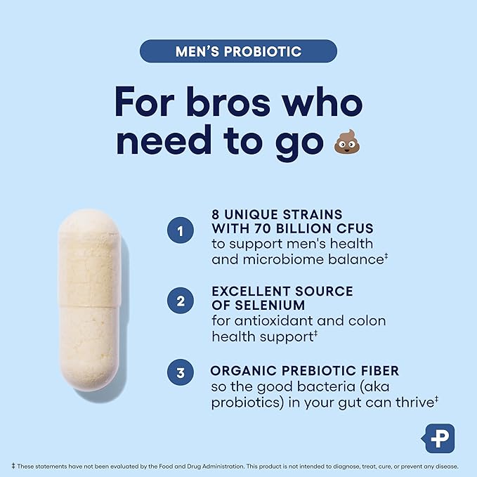 - Once Daily Probiotics for Men: Designed specifically to support men's digestive health and overall well-being. With 8 diverse strains (70B CFU) our probiotic and organic prebiotic blends supports a balanced microbiome, colon and immune health. Same great product you love, with a new look. Packaging May Vary!