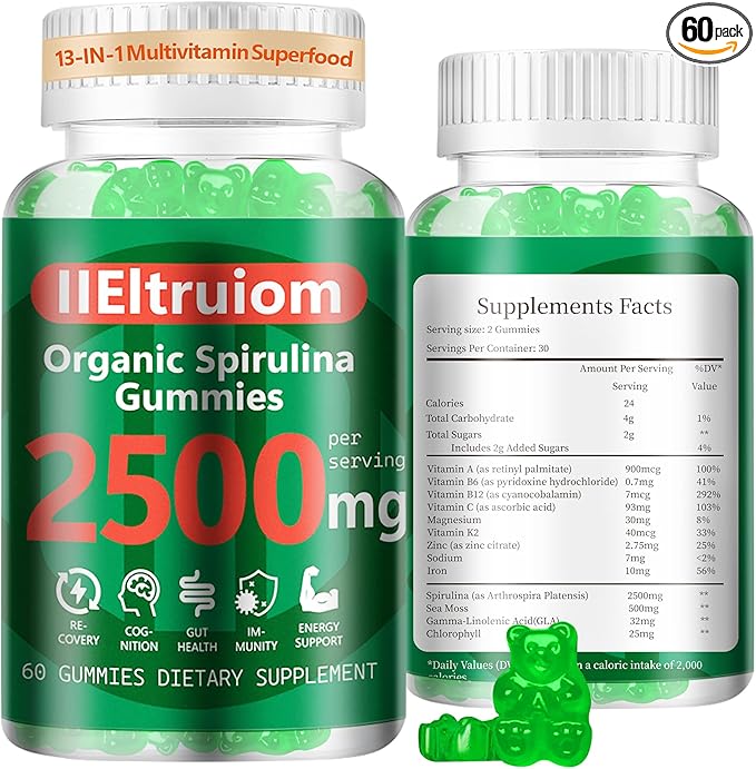 - Spirulina Gummies: Organic Spirulina Gummies from Spirulina Powder Organic (Arthrospira Platensis), 2500mg Per Serving. Green Algae Super Food, Vegan Friendly, Filler Free, Easy to Swallow