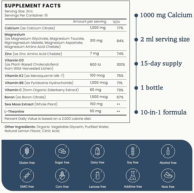 - 【1 Pack 10 In 1 Calcium Magnesium Zinc Supplement】Our lemon-flavored liquid supplement (100% natural vegan) contains calcium, magnesium, zinc, vitamins C, D3, K2, B6, L-Theanine, boron, and seaweed extract. Compared to tablets or capsules, this mineral liquid drops supplement has a higher bioavailability, making its active ingredients more easily absorbed by the intestines. (Non-GMO and dairy-free)