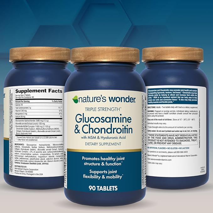 Nature's Wonder Triple Strength Glucosamine Chondroitin with MSM and Hyaluronic Acid and Boswellia for Joint Health, Supports Joint Flexibility and Mobility, 45 Day Supply, 90 Tablets
