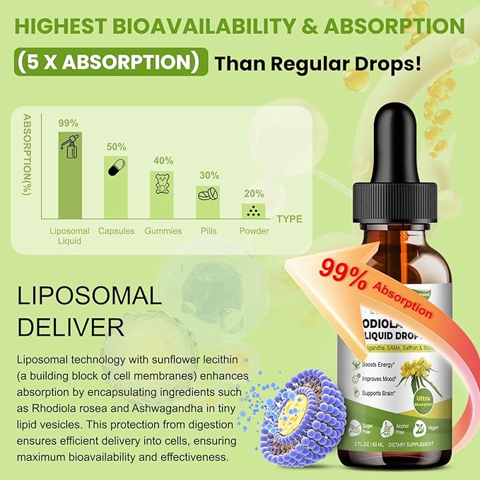 - Highest Absorption & Efficiency: Totaria Rhodiola rosea supplement tincture has higher overall bioavailability by advanced liposomal delivery technology. Boosting 99% absorption rate, enhancing stability in the digestive system by protecting against destruction by stomach acid. Crafted with an alcohol-free cold-extraction extraction process, enjoy advanced and standardized extracts that ensure active 3% Rosavins & 1% Salidrosides, and other active ingredients for the best efficiency.