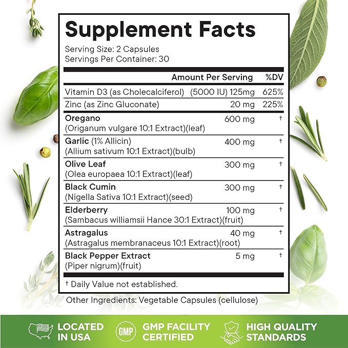 Oregano Oil, Garlic Extract, Olive Leaf, Black Seed Oil, Astragalus-Immune Support & Digestive Health Supplement for Women and Men- 120 Count