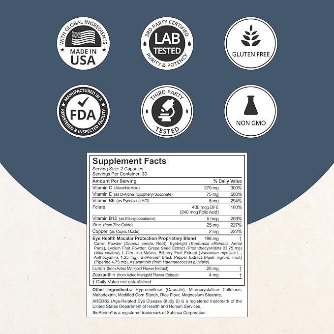 - Plant-Based Antioxidants - Protect your eyes from blue light damage and support long-term eye health with our formula, including Bilberry, Eyebright, Grape Seed, and Carrot Powder, along with Vitamins and Minerals. These antioxidant-rich nutrients are carefully selected to support the macula, an important area of the retina responsible for clear and sharp vision.