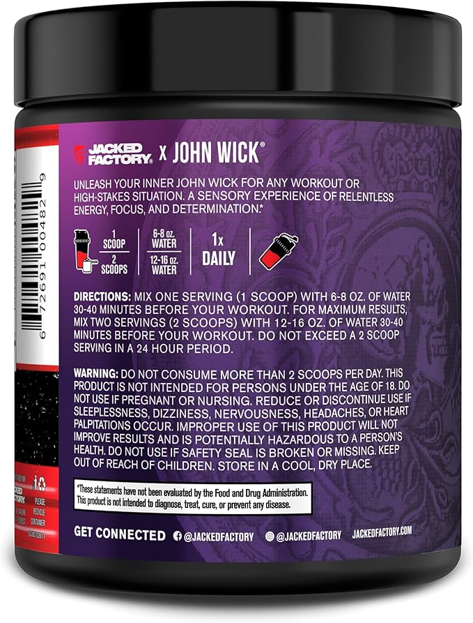 - Sheer Will & Commitment: Embrace the essence of John Wick with every scoop; commitment, and sheer willpower. This pre-workout propels you to an unstoppable state of focus and intense energy.