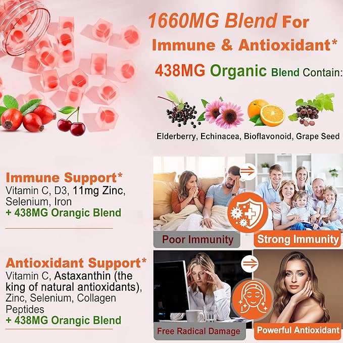 - Organic Blend for Immune Boosting and More: Our formula contains natural vitamins C, D, 11mg zinc, selenium, iron, echinacea, and black elderberry to synergistically support a strong immune system. Vitamin C gummies may help your whole family with daily and seasonal challenges. Helps you recover faster when you feel tired or sick! Extra collagen peptides for better skin! Gentle, highly absorbable glycinate iron and vitamin C work together to promote absorption and increase iron levels.