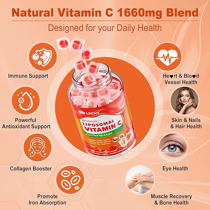 Natural Liposomal Vitamin C 1000mg Gummies for Adults Kids 9+, 1660mg Chewable Vitamin C w/ 11mg Zinc, D3, Elderberry, Echinacea, Bioflavonoid, Astaxanthin - Organic VIT C from Fruits, Sugar Free