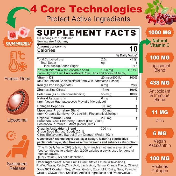 - 4 Core Technologies - lock in activity, improve nutrient stability, absorption rate & bioavailability: Freeze-drying technology minimizes the heat sensitivity & oxidative loss of vitamin C. Liposome technology protects nutrients such as vitamin C from being destroyed by gastric juice. Sustained release technology slows down the release rate of nutrients such as vitamin C. GummieJel technology fills nutrients in the center of the gummy, encapsulating & protecting them from air & high temperature.