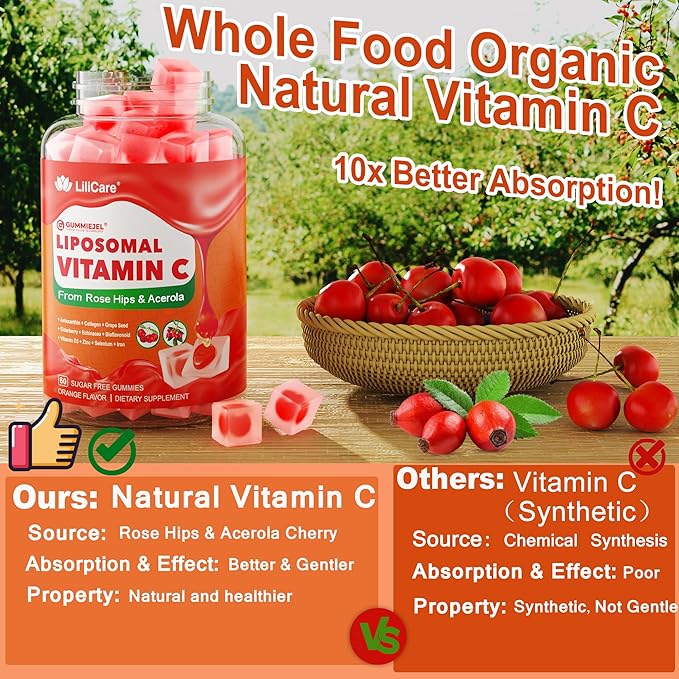 - Whole Food Natural Organic Vitamin C 10X Better Absorption: Our natural vitamin C is derived from rose hips and acerola cherry fruits. Compared to synthetic vitamin C on the market, our vitamin C is the active form of ascorbic acid, and is also rich in minerals such as iron, potassium, magnesium and copper, as well as antioxidants such as vitamin A and E, beta-carotene, anthocyanins and bioflavonoids, which help our body better absorb vitamin C and promote overall health.