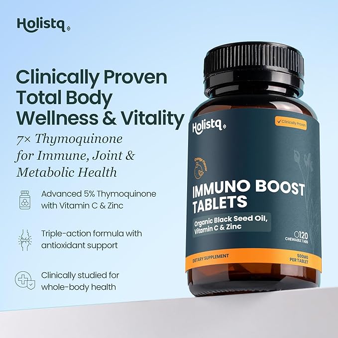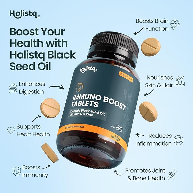 - WHY HOLISTQ IMMUNO BOOST STANDS OUT – Unlike regular Vitamin C supplements, Immuno Boost chewable Vitamin C tablets combine immune system support of Black Seed oil, Vitamin C. and pure Zinc, offering comprehensive approach. Immuno Boost Vitamins C and Zinc aid in digestion, hormone function, and overall well-being. Enjoy consistent vitamins for immune system support with this Vitamin C + Zinc, without the need for multiple supplements, a time-saving, all-in-one solution.