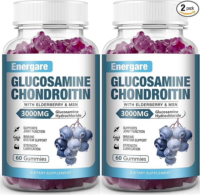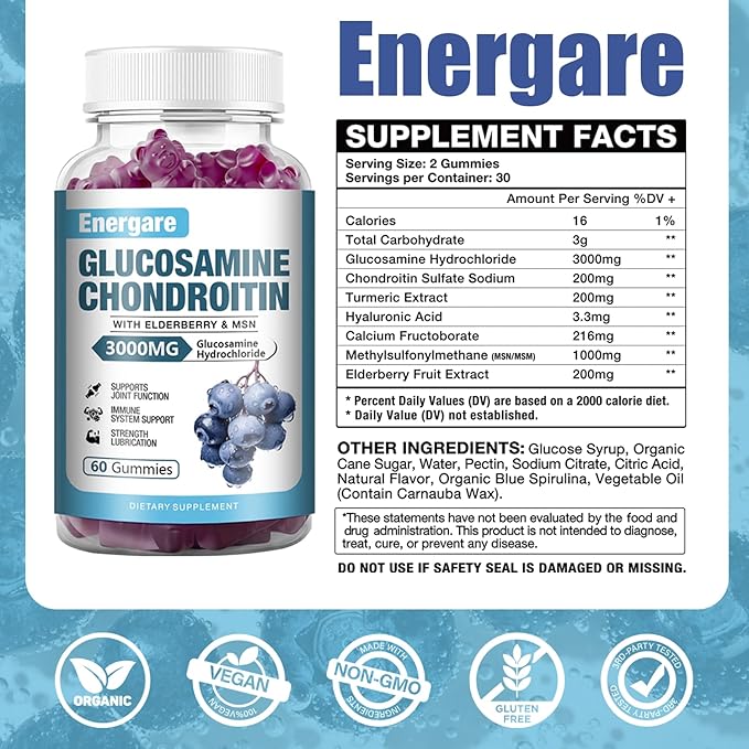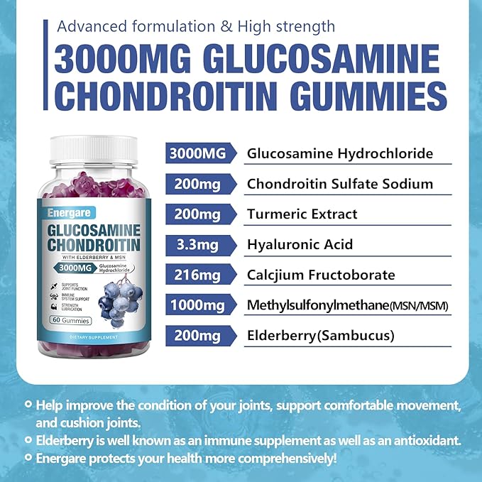 - 3000MG Extra Strength Glucosamine Chondroitin Gummies - Energare joint support supplement glucosamine chondroitin gummies are loaded with 3000mg glucosamine, 1000mg MSM and 200mg Chondroitin to help assist with comfortable movement, cushion joints and support joint structure. Energare glucosamine chondroitin gummies are ideal for sedentary office workers, sports enthusiasts, and adults with joint discomfort.
