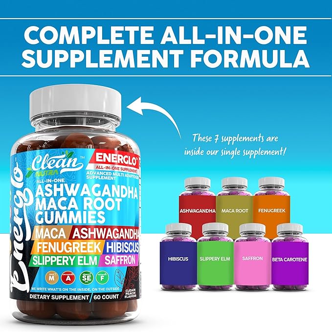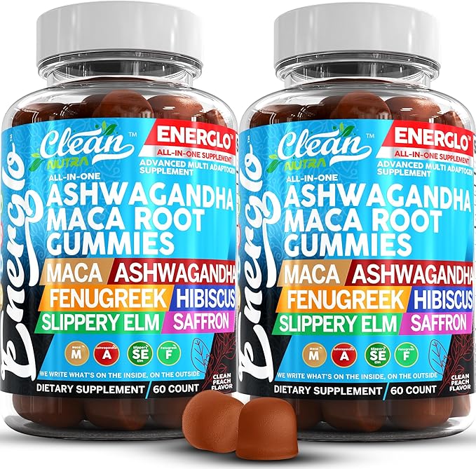 Ashwagandha Maca Root Gummies with Fenugreek Hibiscus Slippery Elm Saffron Extract & Beta Carotene | Peach Flavor Vegan Gummy Vitamins Adaptogen Cortisol Supplement Energlo by Clean Nutra (2)