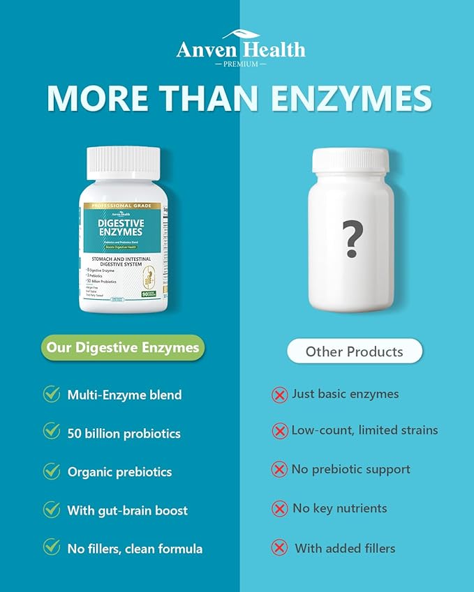 - 800mg Digestive Enzyme Blend -- 8 key enzymes—including amylase, protease & lipase—help break down carbs (rice, bread, pasta), proteins (meat, eggs, shakes), fats (fried foods, creamy dishes), plus dairy & beans. High-strength formula supports faster, more complete digestion.