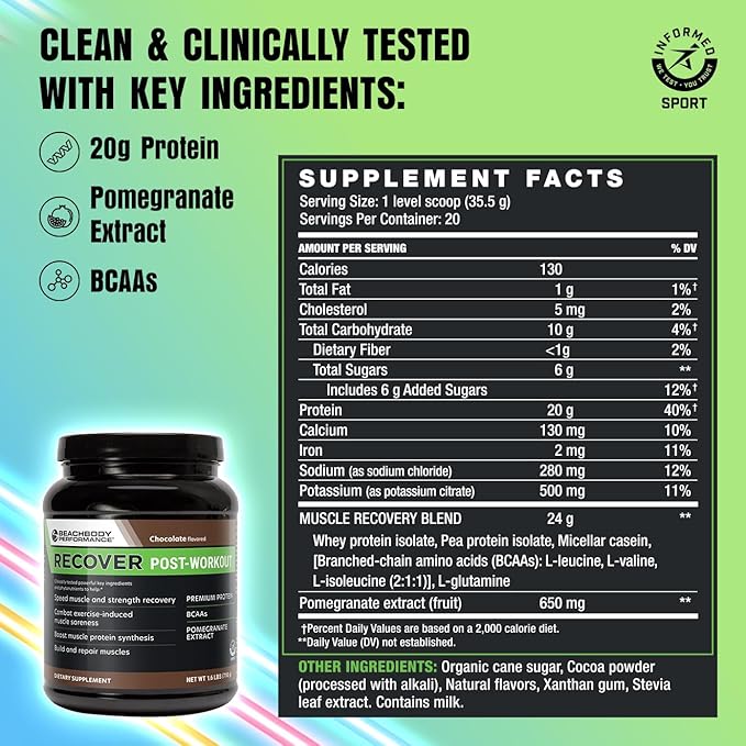 - PURE AND CLEAN NUTRITION: Enjoy an Informed Sport certified product with no synthetic colors, and no artificial flavors, sweeteners, or preservatives. With vegan options available, Beachbody Performance Recover offers a clean, trusted choice for enhancing post-workout recovery.*