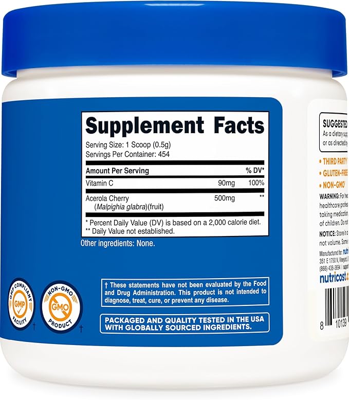 Nutricost Natural Vitamin C - Acerola Cherry Powder 0.5 LB - Gluten Free & Non-GMO