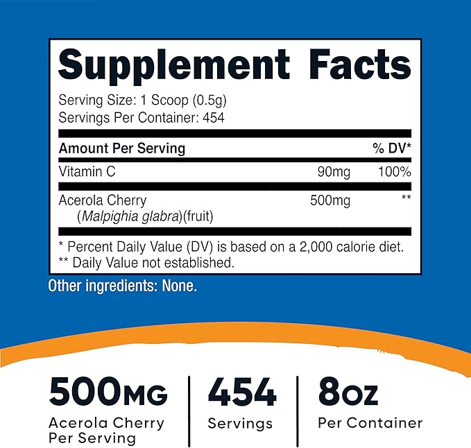 - 500mg of Acerola Cherry Per Serving, 90mg of Vitamin C