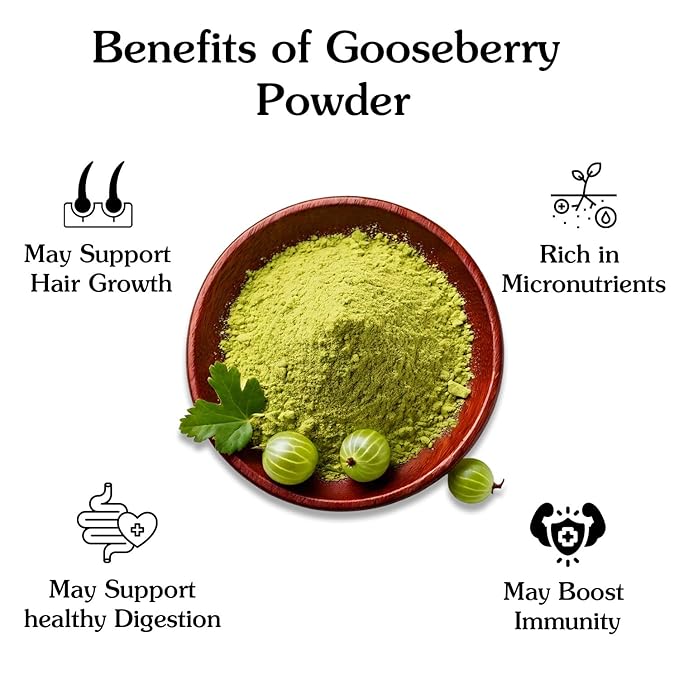 - PROMOTES HAIR GROWTH & HEALTHY SKIN – Known for its Ayurvedic benefits, this Gooseberry powder supports stronger hair, reduces dandruff, improves scalp health, and enhances skin radiance and elasticity.