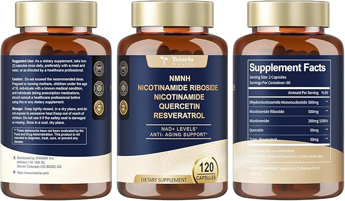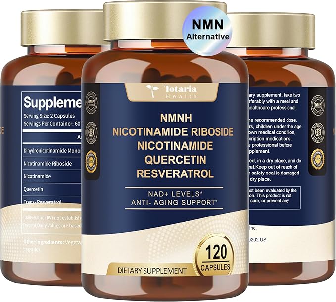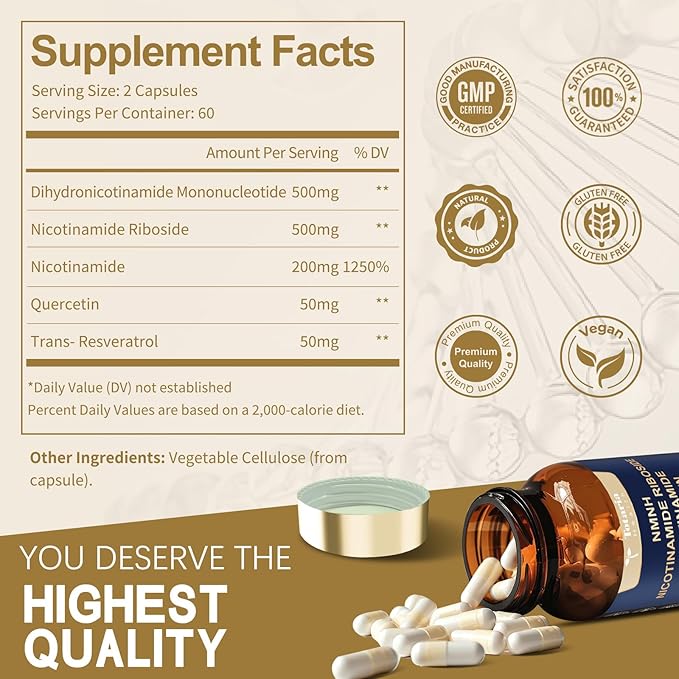 - Powerhouse Formula for Comprehensive Benefits: Our exclusive formula harnesses the synergistic effects of 500mg NMNH, 500mg Nicotinamide Riboside, 200mg Nicotinamide, 50mg Quercetin, and 50mgResveratrol. This advanced blend not only boosts NAD+ levels but also amplifies energy, strengthens the immune system, enhances cognitive function, and safeguards cellular and DNA* health. Each ingredient contributes to a robust defense* against the ravages of time.