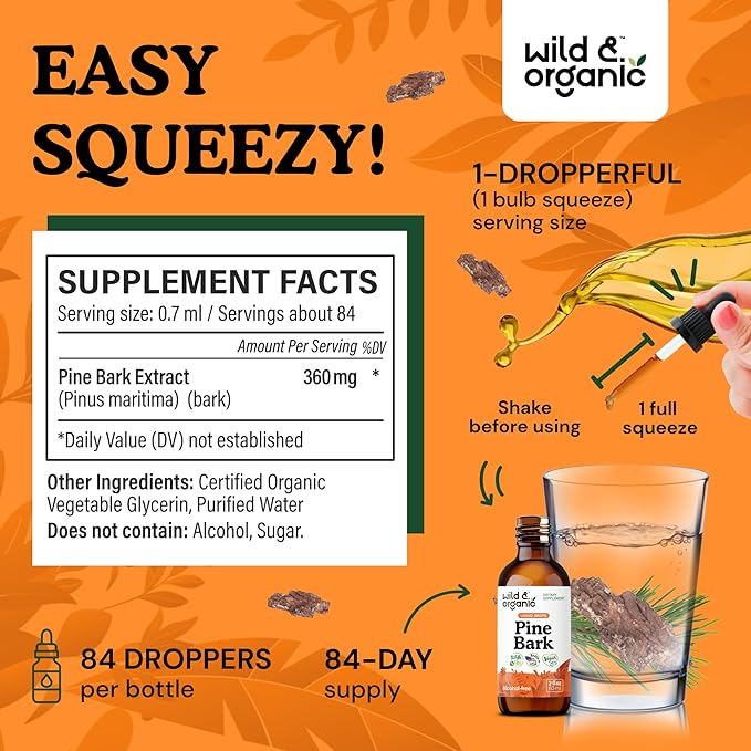 - 84-Day Supply: Each 2 fl. oz. bottle of Wild & Organic pine bark supplement contains 84 servings per bottle, providing an 84-day supply when taken one time per day.