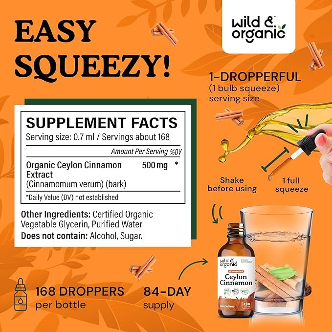 - 84-Day Supply: Each 4 fl. oz. bottle of Wild & Organic Ceylon cinnamon powder based drops contains 168 servings per bottle, providing an 84-day supply when taken two times per day.