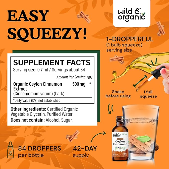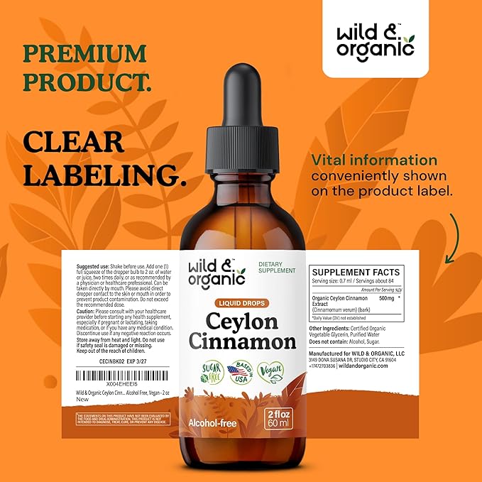 - Overall Support: Each serving of Wild & Organic Ceylon cinnamon tincture contains 500 mg of pure cinnamon extract for overall well-being.
