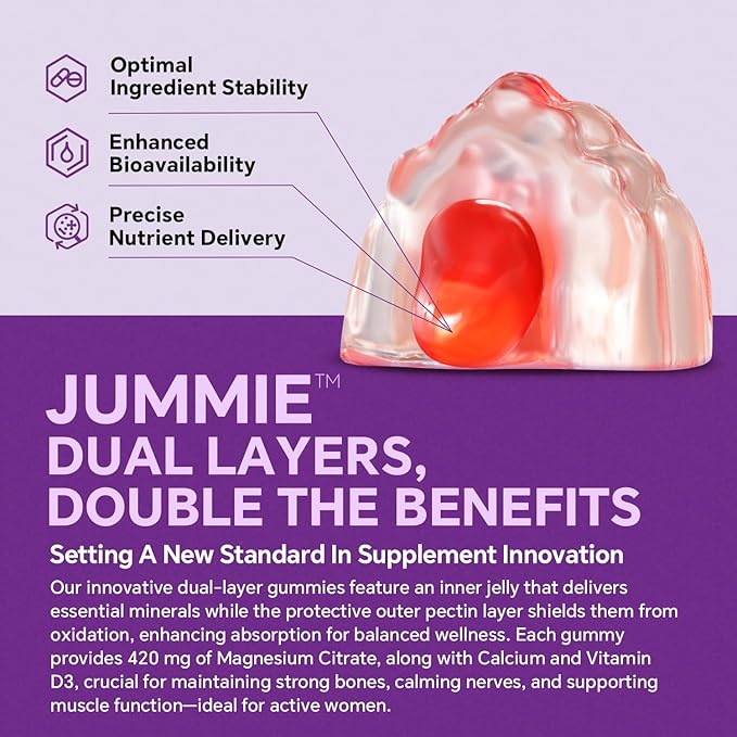 - 👌Dual-Layer Gummy Design: Our innovative dual-layer gummies feature an inner jelly that delivers essential minerals while the protective outer pectin layer shields them from oxidation, enhancing absorption for balanced wellness. Each gummy provides 420 mg of Magnesium Citrate, along with Calcium and Vitamin D3, crucial for maintaining strong bones, calming nerves, and supporting muscle function—ideal for active adult.