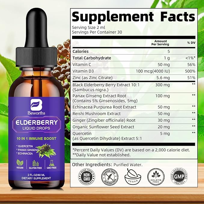 - 【Elderberry Liquid with Vitamin C & Zinc】Our elderberry syrup is enriched with potent antioxidants such as Vitamin C, zinc, and quercetin, offering comprehensive antioxidant support and aiding in skin health, energy levels, digestive function, joint health, and beyond! Elderberry vitamin c and zinc premium elderberry liquid also boasts a blend of panax ginseng root extract, echinacea purpurea root, sunflower seed, ginger root, reishi mushroom, and Vitamin D3, all of which have been proven to enhance your overall wellbeing in diverse ways