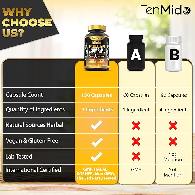 - ❤️ Advanced Formula with a comprehensive combination of Bee Pollen organic, Vitamin D3, Vitamin C, Propolis, Royal Jelly, Turmeric Curcumin, and Carob for Women and Men. Tenmido has developed a potent all-in-one supplement, enriched with 7 potent ingredients. This concentrated bee pollen presents a rich blend of nutrients, provides comprehensive reinforcement for human function and overall health.