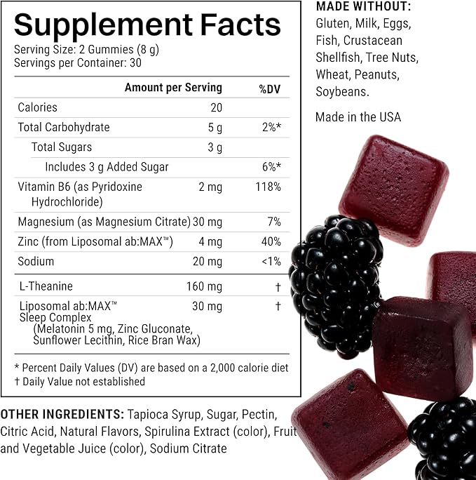Liposomal Sleep Enhancing Gummies, 5 mg Melatonin, 160 mg L-Theanine, 30 mg Magnesium, 4mg Zinc, Improved Sleep, Stress Reducing, Calming Supplement - 30 Servings, BlackBerry Acai Flavor