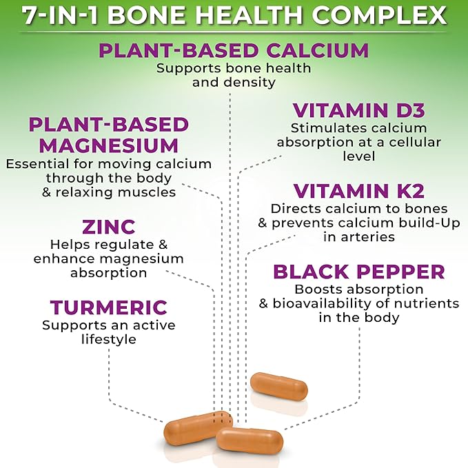 - 7-in-1 Bone Health Complex: Magnesium and vitamin D3 are essential for calcium bioavailability. Zinc enhances magnesium absorption, while vitamin K2 directs calcium to the bones. Turmeric supports active lifestyle and overall wellness, and black pepper improves nutrient bioavailability.