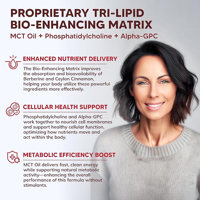 - Tri-Lipid Bio-Enhancing Matrix: Our 60mg lipid matrix includes MCT Oil Powder (from coconut), Alpha-GPC (L-alpha-Glycerylphosphorylcholine), and Phosphatidylcholine (from sunflower lecithin). This proprietary blend enhances nutrient absorption and promotes cellular transport for improved bioavailability of Berberine and Cinnamon.