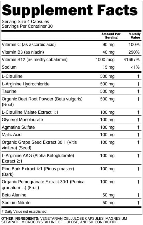 - Organic Beet Root Capsules With Taurine Supplement: Blend of potent ingredients designed to maximize flow with nitric oxide powder, beets supplements, arginine supplement, agmatine sulfate powder, and l citrulline malate, which work together to provide nutrients more efficiently to muscles and organs. Ingredients such as glycerol supplement, B-12 vitamin, vitamin C 1000mg, organic pomegranate, and grapeseed extract capsules promote elasticity and circulatory health for easier workouts.
