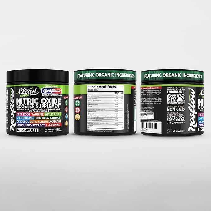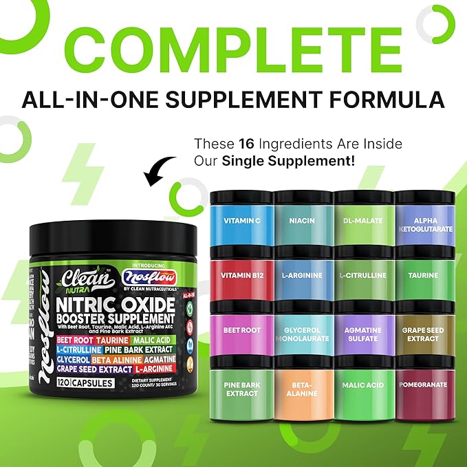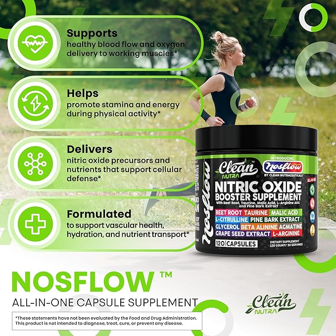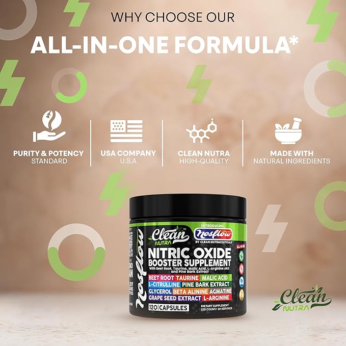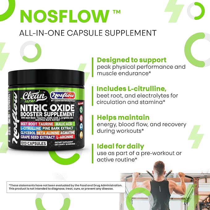 NosFlow Nitric Oxide Supplements for Men | Beet Root Taurine L-Arginine Malic Acid L-Arginine L-Citrulline Pine Bark Glycerol Agmatine Grape Seed Vitamin C B12 B3 by Clean Nutra