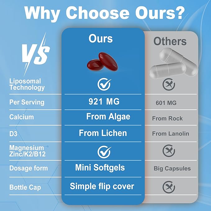 - Liposomal Technology + Softgels: Our Vitamin D3 K2 Calcium supplement uses advanced liposomal technology to protect nutrients from stomach acid and digestive enzymes, delivering them directly into the bl--dstream for better absorption and less digestive discomfort. The sealed softgel structure protects the active ingredients, while its oily matrix enhances the absorption of fat-soluble vitamins D3 + K2. Softgels are easy to swallow, making them especially suitable for elderly individuals.