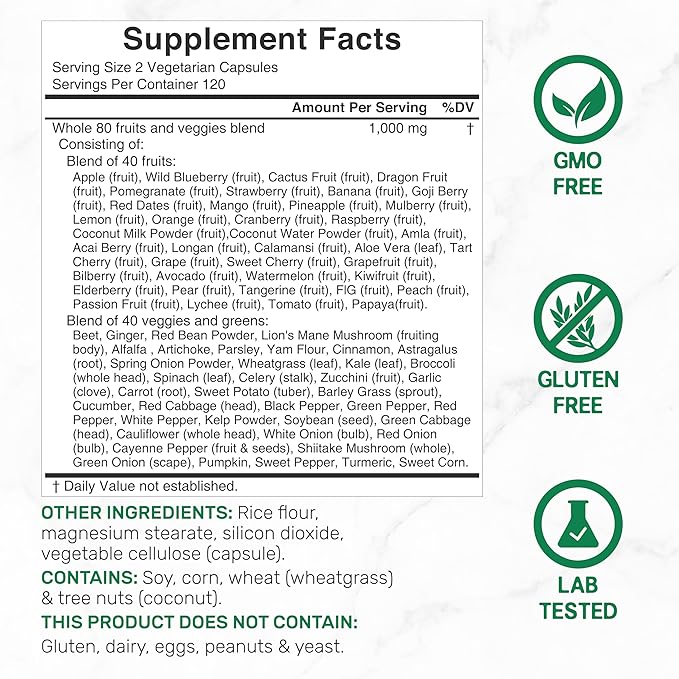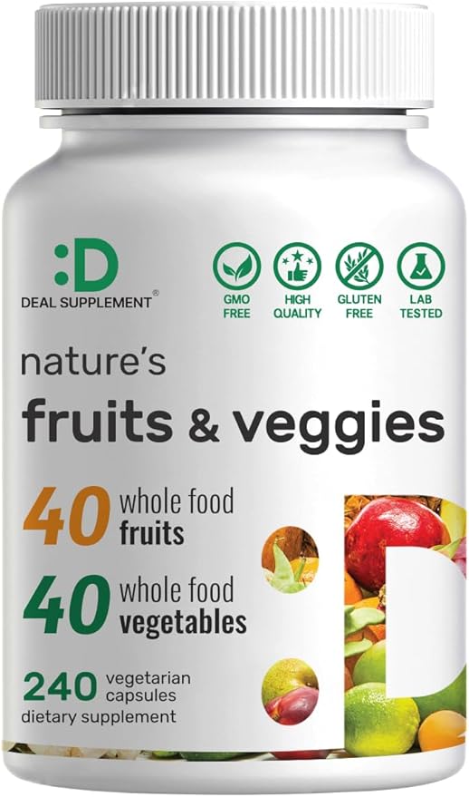 - Special Features – Nature’s Fruits & Veggies whole food supplement. 240 veggie capsules packed with 80 fresh superfoods. Retains natural vitamins, minerals, phytonutrients, and antioxidants.
