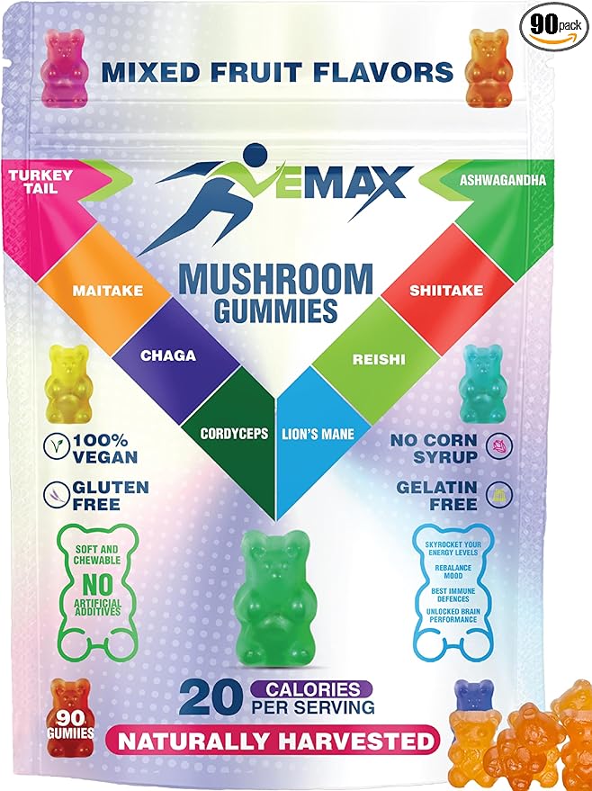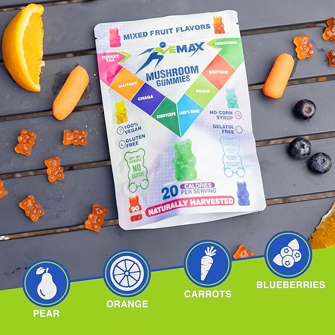 - Organic Mushroom Blend- Turkey tail, Maitake, Chaga, Cordyceps, Lion's Mane, Reishi, Shiitake and Ashwagandha. all combined in a mixed fruit flavor gummy with 45 servings per bag. Supports immunity with traditional medicinal mushrooms