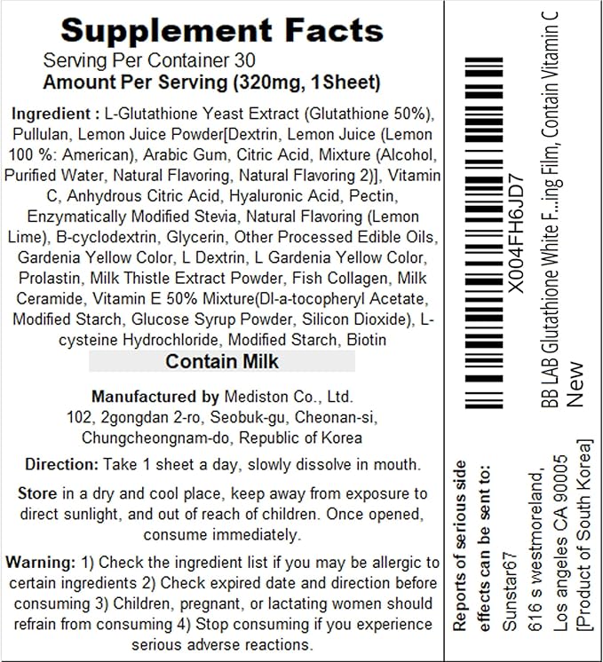 BB LAB Glutathione White Film 320mg*30pcs, Korea Glutathione Direct Film, Quick Absorption, Oral Dissolving Film, Contain Vitamin C