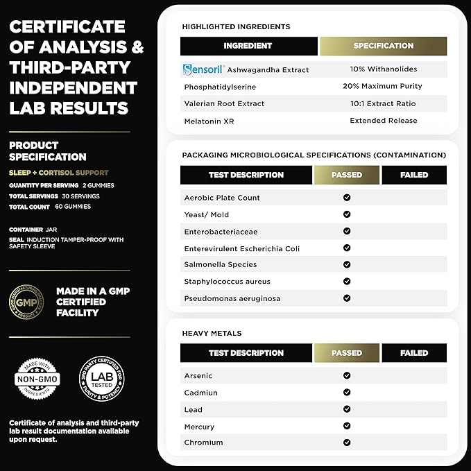 - Special Ingredients : Magnesium Glycinate, Melatonin XR (Extended Release), Phosphatidylserine, Sensorilยฎ Ashwagandha Extract, Valerian Root 10:1 Extract Magnesium Glycinate, Melatonin XR (Extended Release), Phosphatidylserine, Sensorilยฎ Ashwagandha Extract, Valerian Root 10:1 Extract