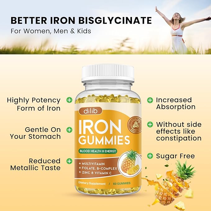 - TASTY PINEAPPLE FLAVOR & GENTLE ON THE STOMACH: Enjoy the delicious fruity pineapple flavor of our sugar free chewable iron supplement gummies, suitable for both adults and kids. Say goodbye to hard-to-swallow and inconvenient iron pills, capsules, and powders. Our iron bisglycinate is better absorbed than most other iron supplements and is gentle on the stomach. This supplement is soy-free, non-GMO, gluten-free, dairy-free, and vegan-friendly. If you are not satisfied with our product for any reason, please contact us at any time.*