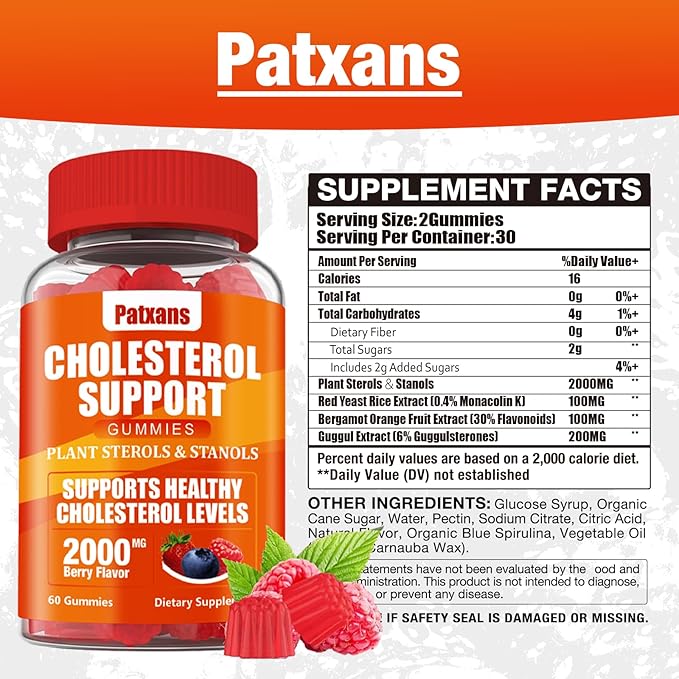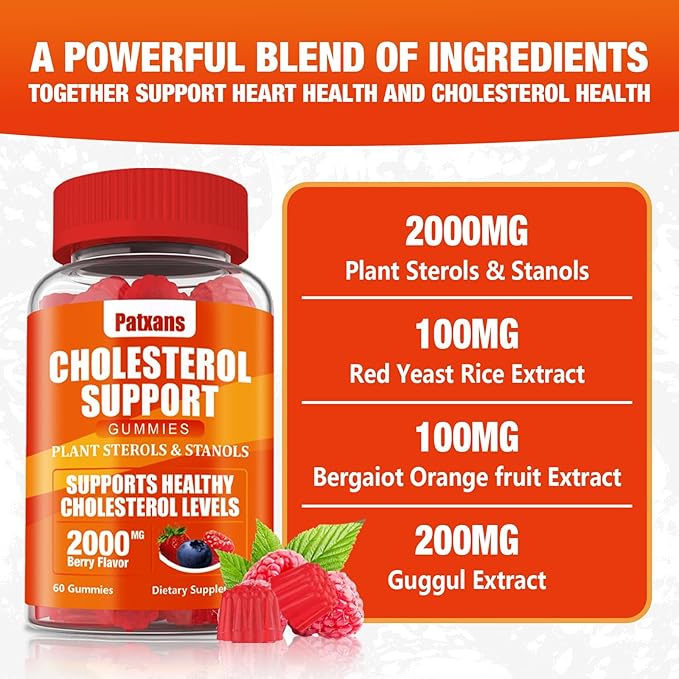 - [Natural Cholesterol Supplement]: Our Patxans cholesterol support gummies combines a powerful mixture of plant sterols & stanols, red yeast rice, citrus bergamot and gugur extracts to provide a convenient and comprehensive solution for managing cholesterol. These ingredients work together to provide more nutritional support and lower your cholesterol levels more effectively.