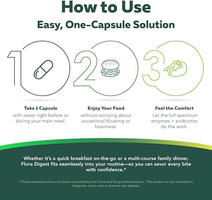 - Easy, Once-Per-Meal Dosing – Enjoy Life’s Meals Again: Take just one capsule with your main meal and let Flora Digest handle the rest. It fits seamlessly into any lifestyle—whether you’re on-the-go or enjoying a sit-down family dinner. From everyday maintenance to special indulgences, our formula helps you savor each bite with confidence.