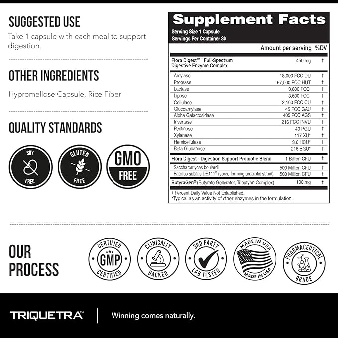 Flora Digest - 3-in-1 Max Strength Digestive Enzymes + Gut Surviving Probiotics & ButyraGen® Postbiotic for Optimal Digestion, Bloating Relief, Regularity, Gut Lining & Colon Support - (30 Capsules)