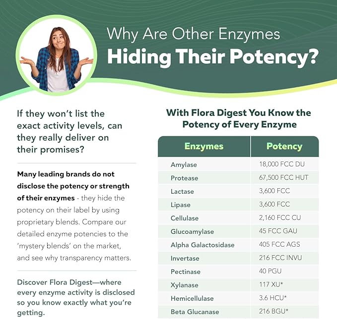 - Transparent Label – Know Your Enzyme Potency: Why Are Other Enzymes Hiding Their Potency?” Many brands lump enzymes into tiny proprietary blends. We list exact FCC units for each digestive enzyme, so you know you’re getting a truly potent digestion supplement that stands out. Don’t settle for guesswork—choose Flora Digest for honest, high-strength enzymes.