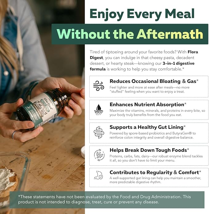 - 3-in-1 Digestive Synergy for Women & Men: Experience complete support from stomach to colon with Flora Digest—combining digestive enzymes, probiotics, and postbiotics in one powerful formula. Whether you’re searching for digestive enzymes for women or digestive enzymes for men, our robust blend helps break down proteins, carbs, fats, and dairy, making it the best digestive enzymes solution for daily use.