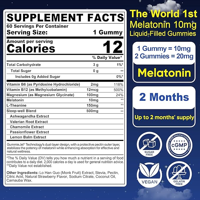 - [Delicious Filled Gummies ] GummieJel Technology’s dual-layer design, featuring a protective pectin outer layer, stabilizes essential melatonin and enhances absorption. Enjoy these sugar free melatonin gummies with a strawberry flavor — sweetened with monk fruit. Plant pectin provides a refreshing taste without artificial aftertaste. A tastier way to support your nighttime routine.
